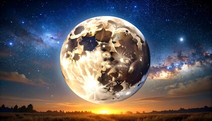 A luminous celestial body, resembling a moon, floats over a landscape at sunrise. A starry night sky forms the backdrop