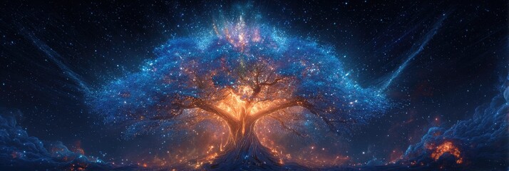 A luminous tree, ablaze with inner fire and celestial blue, stands majestically against a dark, star-dusted sky, cosmic streams arching overhead