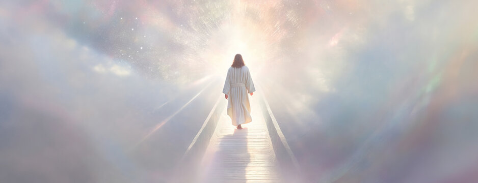 Staircase or Path to heaven, the concept of enlightenment. Human stands in front of the Paradise gates. Banner