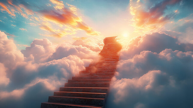 A majestic staircase leading to heaven, surrounded by clouds and sunlight