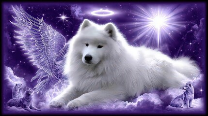 A stunning artwork featuring a serene white Samoyed dog surrounded by ethereal clouds and celestial elements, ideal for use in pet-related themes, fantasy art, or inspirational designs,