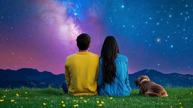 Couple and Dog Watching Milky Way Under Starry Night Sky