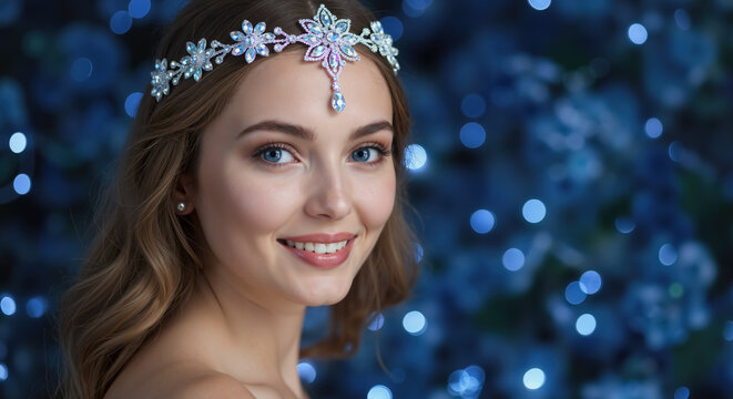 Moonlit snow princess wearing golden tiara and snowflake gown, magical winter fantasy