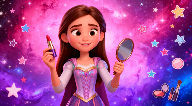 Cute 3d cartoon illustration of a young princess in a vibrant purple dress, she holds lipstick and a mirror against a starry cosmic background, surrounded by makeup items and twinkling stars