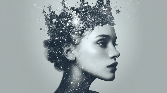 A grayscale portrait of a woman's profile, adorned with a shimmering crown, sparkles floating around her head