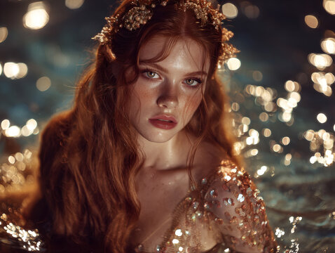 Serene goddess with flowing white gown and golden crown, before a full moon.