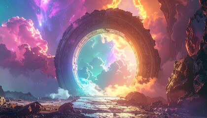 Dreamlike portal amidst celestial clouds atop rocky terrain, leading to a vibrant, otherworldly realm
