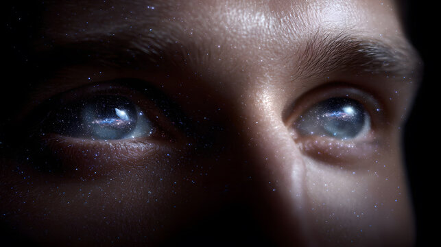 Gazing into the Universe: Close-up of eyes, reflecting the cosmos with a mysterious depth, inviting the viewer into a realm of wonder and contemplation.