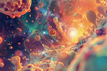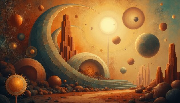 Colorful abstract artwork depicting celestial spheres and flowing formations