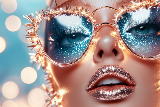 woman adorned in shimmering metallic sapphire blue and rose gold jewelry basks in vibrant holiday lights. Its mane glows, and its oversized sunglasses reflect star and ornament shapes