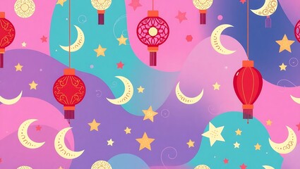 Colorful background with lanterns moons and stars creating a festive and whimsical atmosphere