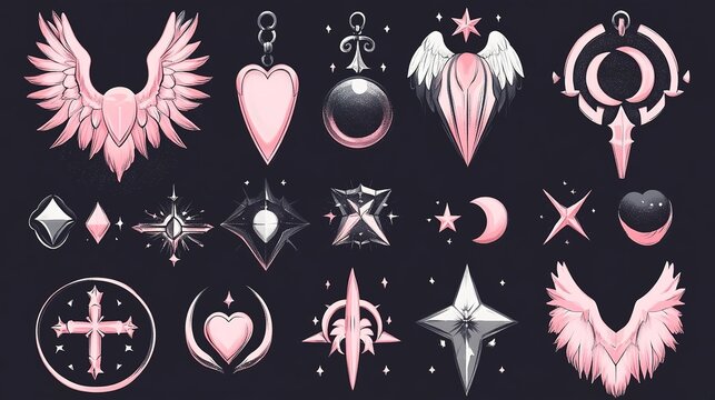 Set of decorative, stylized celestial and heart-shaped emblems