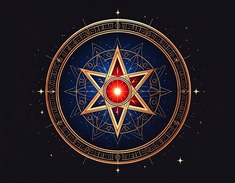 Ornate golden starburst design, surrounded by celestial elements, glowing