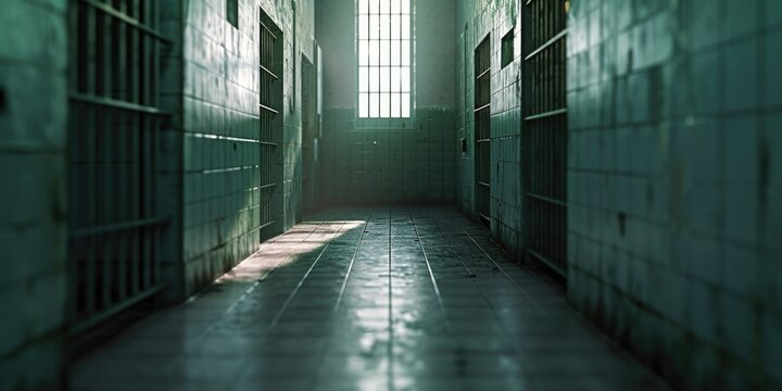An empty prison cell block with an open door. Can be used to depict the concept of freedom or the aftermath of a prison escape