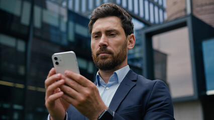 Businessman analyzing infographics and data on cellphone