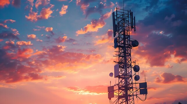 High telecommunication cell tower antenna in asian countryside nature on the background of the silhouettes of the mountains at beautiful orange sunset