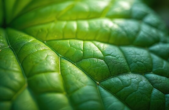 Macro view of vibrant green leaf veins. Detailed texture shows plant cellular structure. Organic nature pattern with copy space for science or eco themes.
