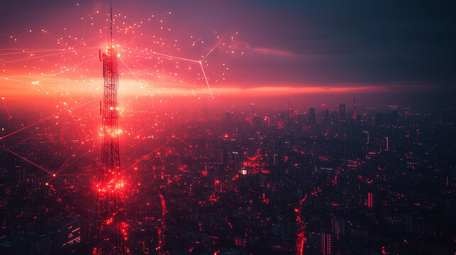 UAV drone flying near 5G cellular antenna during dramatic sunset, communication network. Telecommunication, smart city, Internet of Things