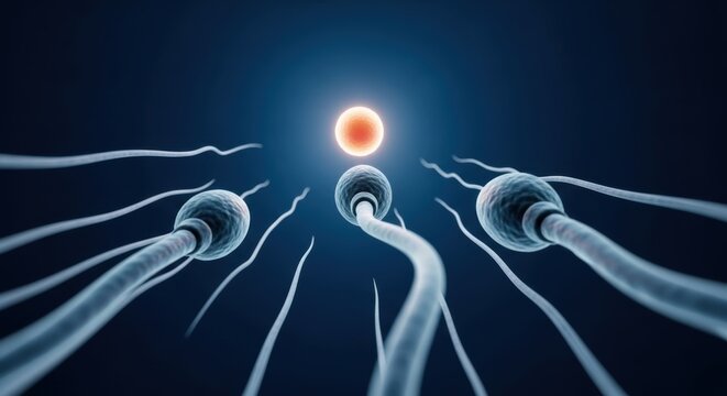 Spermatozoa Approaching Egg Cell, Fertilization Process, 3D Render