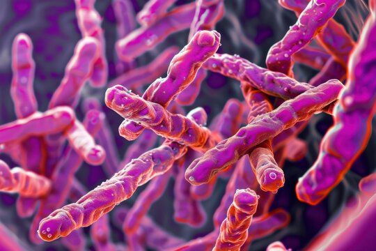 Vibrant microscopic view of pink rod shaped bacteria cells, detailed scientific illustration, medical research concept