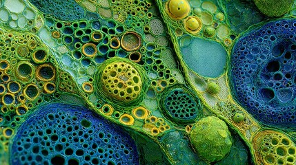 Intricate microscopic cross-section revealing vibrant plant tissue cellular architecture with