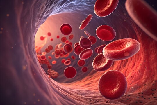 Detailed visualization of human red blood cells flowing in the bloodstream demonstrating their unique biconcave shape and vital role in oxygen transport