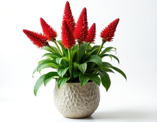 Red celosia cockscomb flower in textured gray pot. Vibrant plant with green leaves grows indoors. Tropical floral subject for home decor or garden.