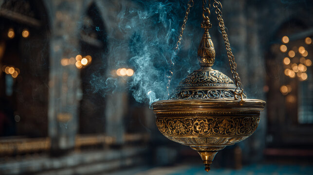 Incense burner with smoke hanging in a dark church or mosque interior, a religious ceremony concept. Background with golden lights