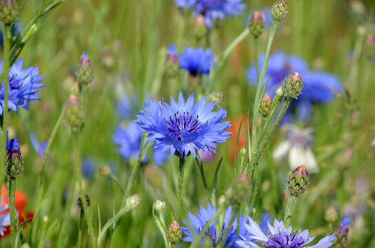Cornflower, Centaurea cyanus Rare flower of Arable Fields. blue wildflowers, natural floral background. Wild flowers, close-up, blurred background. summer meadow flower, blooms beautifully in blue.
