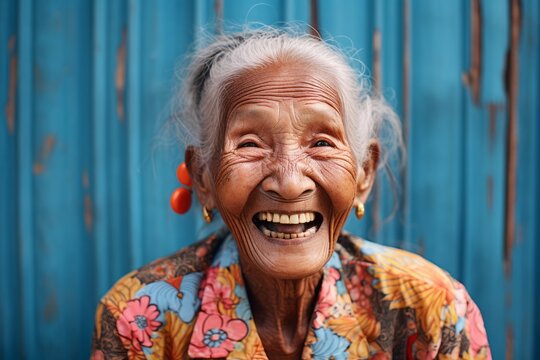 Lifestyle portrait photography of a happy 100-year-old elderly Indonesian woman wearing a denim jacket against an abstract background