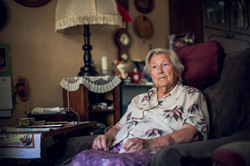 Elderly lady, a centenarian, in her living room at home