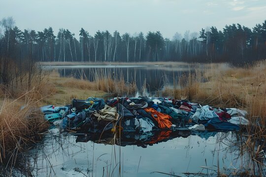 pile of discarded clothes by a body of water in the style of Minimalist Music centered professional photo copy space. Concept Minimalist Photography, Clothing by Water, Professional Photoshoot