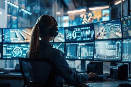 network operations center (NOC) with technicians monitoring network traffic, troubleshooting issues, and ensuring network performance for a high-tech and dynamic visual representation