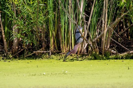 The green heron (Butorides virescens) on the hunt. Ts a small heron of North and Central America.