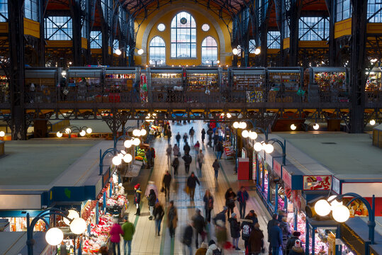 BUDAPEST, HUNGARY - JUNE 2019: Interiors of Central Market Hall of Budapest, Hungary