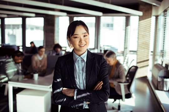 Successful confident young businesswoman ceo boss bank employee worker manager with arms crossed in formal wear at the office