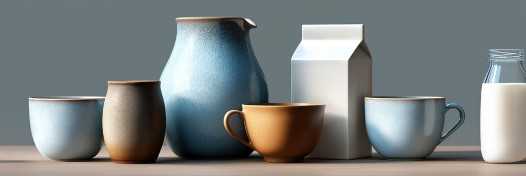 Assorted ceramic cups and milk carton on wooden table