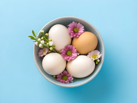 Modern eggs and flower in ceramic bowl on blue minimalist background for fresh cooking design concept
