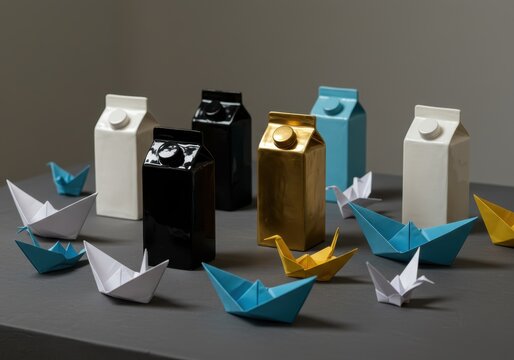 Colorful milk carton ceramics with origami boats on gray surface