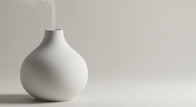 Minimalist white ceramic vessel emits a fine stream of vapor against a light background