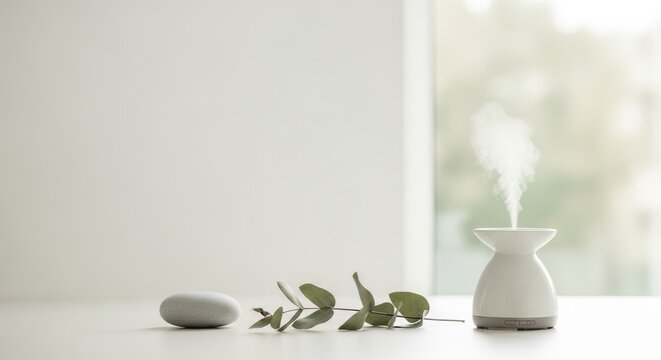 Matte ceramic aroma diffuser releasing thin vapor with blurred face for spa wellness