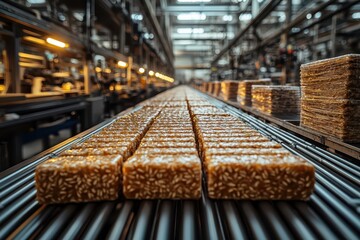 Granola bars on conveyor belt in modern food production factory