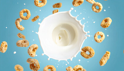 Dynamic milk floating in a circle and cereal splashing on a blue background