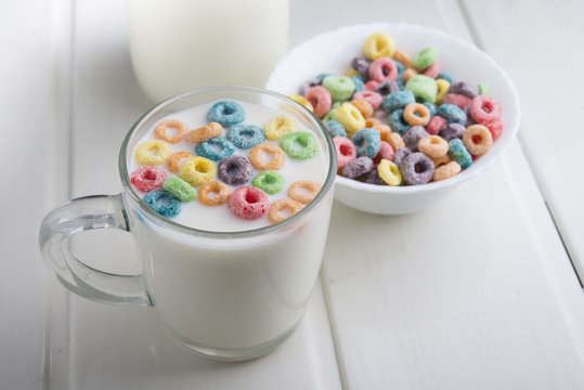 Pile of delicious and nutritious fruit cereal rings isolated on a white background. Colored sweetened corn cereals.