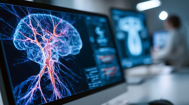 Close-up of brain scan on a computer screen. Other screen in soft focus. Research setting