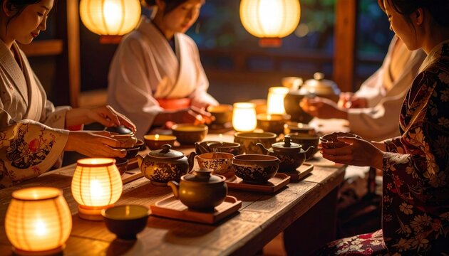 A serene tea ceremony setup with traditional teaware on a simple wooden table Stock Photo with side copy space