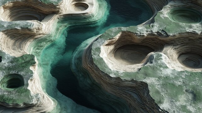 Dynamic flowing water intertwines with organic stone formations in a nature-inspired 3D CGI render