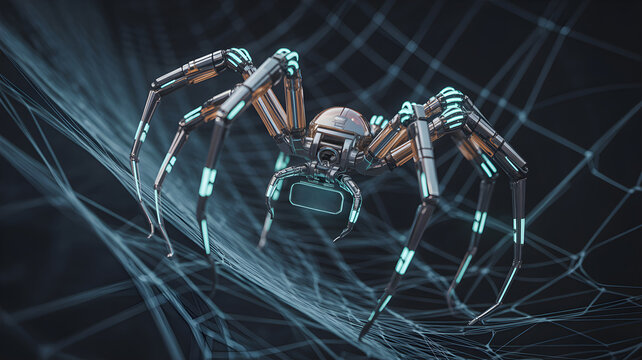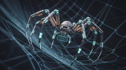 Biomechanical spider crawling on web, futuristic robotics and ai