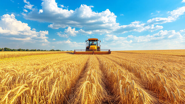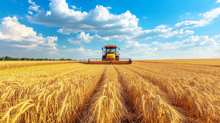 Wheat harvesting on field in summer season. modern harvesters with grain header, wide chaff spreader cut and threshes ripe wheat grain . Process of gathering crop by agricultural machinery