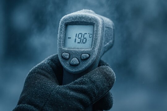Cold chain logistics warehouse logistic. Digital thermometer showing minus nineteen point six degrees Celsius temperature cold winter day with